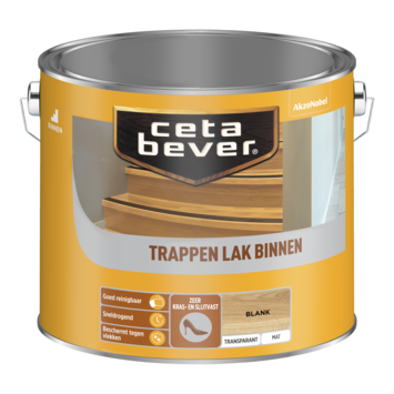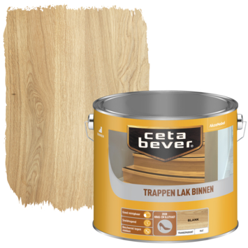 CetaBever Trappenlak transparant blank mat 2,5 liter is een watergedragen lak verkrijgbaar in mat, zijdeglans en zijdeglans anti-slip. Het beschermt en verzorgt uw hout en geeft uw hout een prachtige kleurloze eindlaag waarbij de houtnerf zichtbaar blijft. CetaBever Trappenlak is ook verkrijgbaar als dekkende variant.