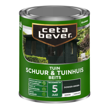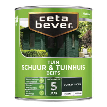 CetaBever Tuinbeits Schuur & Tuinhuis zijdeglans dekkend donkergroen 750 ml is een hoogwaardige watergedragen beits. Deze beschermt het schilderwerk en hout al na 1 uur na aanbrengen tegen regen en vocht, doordat er een waterdichte afsluiting op de buitenste laag van de beits wordt gevormd. Tuinbeits Schuur & Tuinhuis is beschikbaar in zowel dekkende als transparante kleuren.