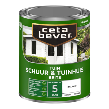 CetaBever Tuinbeits Schuur & Tuinhuis zijdeglans dekkend RAL 9010 gebroken wit 750 ml is een hoogwaardige watergedragen beits. Deze beschermt het schilderwerk en hout al na 1 uur na aanbrengen tegen regen en vocht, doordat er een waterdichte afsluiting op de buitenste laag van de beits wordt gevormd. Tuinbeits Schuur & Tuinhuis is beschikbaar in zowel dekkende als transparante kleuren.