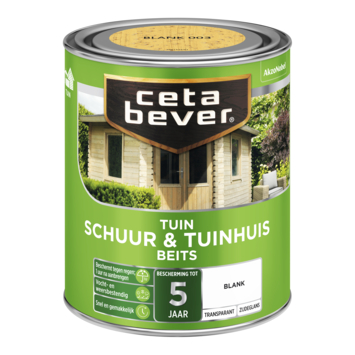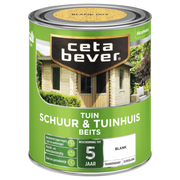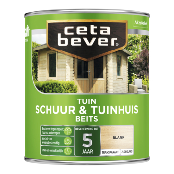 CetaBever Tuinbeits Schuur & Tuinhuis zijdeglans transparant blank 750 ml is een hoogwaardige watergedragen beits. Deze beschermt het schilderwerk en hout al na 1 uur na aanbrengen tegen regen en vocht, doordat er een waterdichte afsluiting op de buitenste laag van de beits wordt gevormd. Tuinbeits Schuur & Tuinhuis is beschikbaar in zowel dekkende als transparante kleuren.