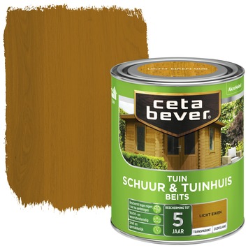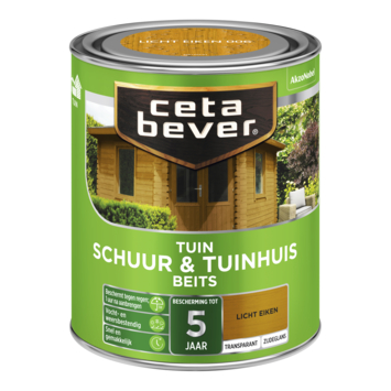 CetaBever Tuinbeits Schuur & Tuinhuis zijdeglans transparant licht eiken 750 ml is een hoogwaardige watergedragen beits. Deze beschermt het schilderwerk en hout al na 1 uur na aanbrengen tegen regen en vocht, doordat er een waterdichte afsluiting op de buitenste laag van de beits wordt gevormd. Tuinbeits Schuur & Tuinhuis is beschikbaar in zowel dekkende als transparante kleuren.