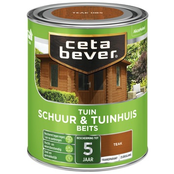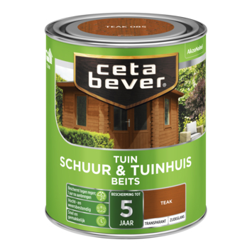 CetaBever Tuinbeits Schuur & Tuinhuis zijdeglans transparant teak 750 mlis een hoogwaardige watergedragen beits. Deze beschermt het schilderwerk en hout al na 1 uur na aanbrengen tegen regen en vocht, doordat er een waterdichte afsluiting op de buitenste laag van de beits wordt gevormd. Tuinbeits Schuur & Tuinhuis is beschikbaar in zowel dekkende als transparante kleuren.