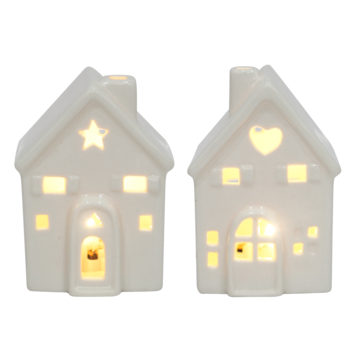 Christmas Goods decoratie keramiek kersthuisje met LED verlichting 6.5 x 9 x 5.7 cm