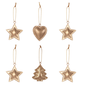 De Christmas Goods figuur kerstdecoratie ornament metaal goud 6 stuks is een prachtige set waarmee je jouw kerstboom of interieur een luxe uitstraling geeft. De set bevat zes stijlvolle hangers, waaronder sterren, een hartje en een kerstboom. Ze zijn uitgevoerd in een warme goudkleur en gemaakt van metaal, waardoor ze stevig en elegant tegelijk zijn. Dankzij hun subtiele glans combineren ze moeiteloos met andere kerstdecoratie. Perfect om een chique en sfeervol geheel te creëren tijdens de feestdagen.