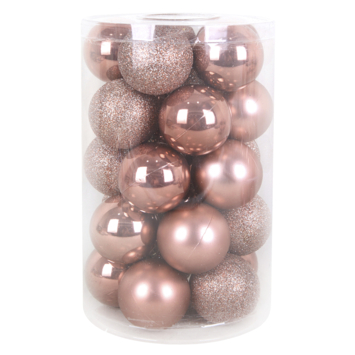 Met de Christmas Goods kerstballen mix kunststof 25 stuks donkerroze geef je jouw kerstboom een eigentijdse en elegante uitstraling. De warme donkerroze tint zorgt voor een chique basis die prachtig combineert met zachte pastels, goud of zilver. Deze set van 25 kunststof kerstballen bestaat uit een mix van matte en glanzende afwerkingen, waardoor je boom direct meer diepte en variatie krijgt. Dankzij het lichte materiaal hang je ze eenvoudig op, zelfs in de hogere takken. Perfect om in één keer een stijlvolle en persoonlijke sfeer te creëren die jouw kerstdecoratie helemaal afmaakt.