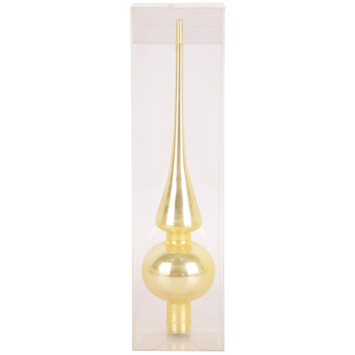 De Christmas Goods piek glas champagne 26 cm maakt jouw kerstboom helemaal af. Met zijn elegante champagnekleur en verfijnde glans voegt deze piek een vleugje luxe toe aan je kerstdecoratie. Het glazen materiaal geeft een stijlvolle uitstraling en reflecteert prachtig het licht van je kerstverlichting. Met een hoogte van 26 cm is deze piek een opvallend middelpunt dat je boom een harmonieuze en feestelijke uitstraling geeft.