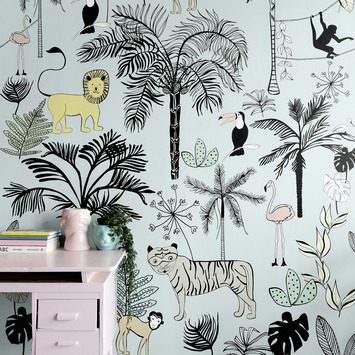 Van het Claas fotobehang jungle lichtblauw zal je kind helemaal blij worden. Het behang heeft een vrolijke print en is eenvoudig aan te brengen. Voor een zo goed mogelijk resultaat dienen de te beplakken oppervlaktes droog, egaal van kleur en vlak te zijn. Dit behang is ook te koop in een beige of groene uitvoering en is onderdeel van onze collectie Claas kinderbehang.