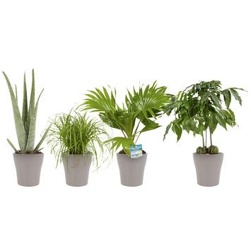 Leuke combibox van vier verschillende eigentijdse groene planten in matantraciet bloempot. De box bestaat uit: een Aloë Vera (hoogte 25 cm), een Australische Kastanje (hoogte 30 cm), een Waaierpalm (hoogte 30 cm) en Kattengras (hoogte 23 cm). De vier planten hebben een potmaat van 12 centimeter in diameter.