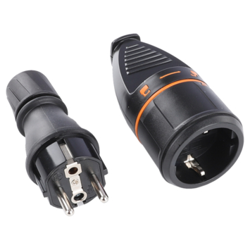 Deze contrastekker zwart wordt verkocht samen met een buitenstekker. Beide stekkers zijn van rubber en daardoor (spat)waterdicht (IP44). Dankzij de fixeerring is de contrastekker extra goed beschermd tegen vocht en vuil.