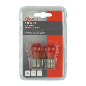 De Cosmic autolamp 21W oranje 2 stuks zijn lampen die je gebruikt voor de richtingaanwijzers, zowel voor als achter. In deze set vind je twee PY21W BAU15s lampen. De autolampen zijn voorzien van bajonetfitting voor een stevige sluiting. Wanneer de knipperlicht in de auto ineens veel sneller gaan, kan dit duiden op een defect in één van de lampen.