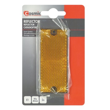 De Cosmic reflector 90x4 mm oranje 2 stuks is voor aan de zijkanten van onder andere de aanhangwagen, caravan of trailer zodat deze beter zichtbaar is vanaf de zijkant. De oranje reflectoren van 90x40 millimeter hebben schroefbevestiging en worden per twee geleverd. Reflectoren zijn verplicht te gebruiken, dus twijfel niet en zorg dat je reflectoren in orde zijn.