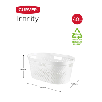 De Curver Infinity Dots wasmand 40L in de kleur wit is gemaakt van volledig gerecycled materiaal. Dankzij de open structuur kan het wasgoed voldoende luchten. De Infinity Dots wasmand is voorzien van comfortabele handvaten en is gemakkelijk schoon te maken. De Dots wasmand 40L is ook verkrijgbaar in de kleur antraciet en groen.
