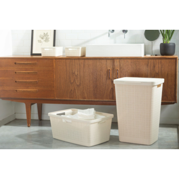 De Curver Jute Wasbox 46L combineert een natuurlijke geweven look met praktische voordelen. De open structuur zorgt voor voldoende ventilatie, waardoor je wasgoed fris blijft en nare geurtjes geen kans krijgen. De Jute-lijn biedt een ruime keuze, met een bijpassende wasmand en opbergmanden in vijf verschillende maten. Daarnaast zijn alle producten uit deze collectie gemaakt van meer dan 70% gerecycled materiaal, wat bijdraagt aan een duurzame en stijlvolle inrichting van je huis.
