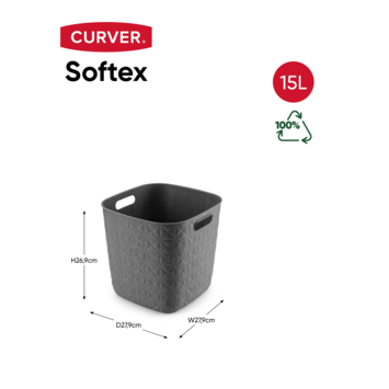 Ontdek de ruime en stijlvolle Curver Softex mand in Dark Grey. Dit model is vervaardigd uit exclusief Softex materiaal, voor 70% gerecycled, en beschikt over een uniek opgevuld patroon, geïnspireerd op traditionele weef- en stiktechnieken. Dankzij de comfortabele handvatten en een royale inhoud van 15 liter is deze mand de ideale oplossing voor extra opbergruimte in jouw woonkamer, slaapkamer of kantoor. Combineer hem moeiteloos met andere Softex manden en geef jouw interieur een moderne en duurzame uitstraling. Laat je inspireren door de perfecte mix van kwaliteit en design!