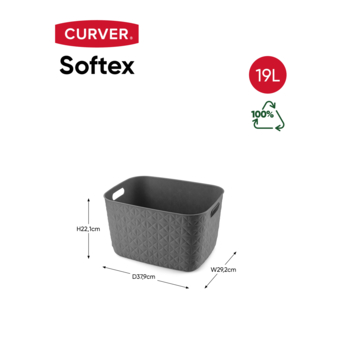 Ontdek de royale en stijlvolle Curver Softex mand in Dark Grey. Vervaardigd uit exclusief Softex materiaal, voor 70% gerecycled, heeft deze mand een uniek opgevuld patroon, geïnspireerd op traditionele weef- en stiktechnieken. Dankzij de comfortabele handvatten en een indrukwekkende inhoud van 19 liter is deze mand ideaal voor extra opbergruimte in jouw woonkamer, slaapkamer of kantoor. Combineer hem moeiteloos met andere Softex manden en geef jouw interieur een moderne, duurzame uitstraling. Laat je inspireren door de perfecte mix van kwaliteit en design!