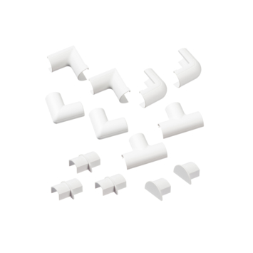10 slimme accessoires voor kabelgoot 20x10mm Wit 1x vlakke buigclip over - Verander de richting 90º op vlakke oppervlakken. 2x Interne buigclip - Verbindingslengtes rond 90º in de binnenhoeken 2x Externe buigclip over - verbindingslengtes rond 90° buitenhoeken 1x Gelijke T-clip over - Gebruik deze om 3 lengtes van hetzelfde profiel te verbinden. 2x Coupler Smooth Fit - Verbind 2 lengtes van hetzelfde profiel op een vlakke ondergrond. 2x Eindkap Vlotte pasvorm - Maak open uiteinden netjes glad.