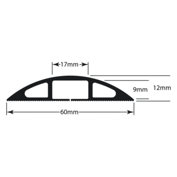 EU/CC-2 D-Line kabelgoot voor de vloer. De kabelbeschermer voor de vloer creëert gemakkelijk orde van kabels en beschermt kabels tegen breuk en voorkomt het risico van struikelen, thuis of op kantoor. Bedekt kabels op de vloer thuis of op kantoor in ruimtes die regelmatig worden gebruikt. Het kan ook worden gebruikt voor beurzen en evenementen. Het afgeschuinde ontwerp is bijzonder geschikt voor voetgangers. De D-Line CC-2 kabelbrug heeft een interne holte van 17x 9mm en biedt plaats aan maximaal twee 8mm kabels. De geribde basis en gespleten achterkant maken het gemakkelijk te gebruiken, omdat de kabels kunnen zeer gemakkelijk worden ingevoegd. • Ideaal voor licht voetverkeer • Pakt een veel voorkomende oorzaak van reizen, sleepboten en vallen • Kan kabels met een diameter tot 2x 8 mm beschermen • Geribbelde antislipbasis, en gespleten onderkant • Flexibel PVC – opgerold geleverd Flexibel uit te rollen en ligt direct plat, geen tape nodig • Volledig getest en gecertificeerd voor BS EN 60670-1:2005