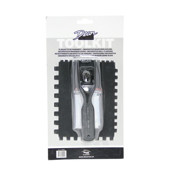 De Decor Toolkit is het ideale hulpmiddel voor het verwerken van siersteenstrips zodat de natuurlijke schoonheid en uitstraling van deze decoratieve wandbekleding optimaal naar voren komt. Dit pakket bestaat uit een rasp voor het afschaven dan wel verruwen van de achterkant van de siersteenstrips, een lijmkam voor het aanbrengen van de lijm en een spuitzak, waarmee de voeg gemakkelijk in het geheel verwerkt kan worden.