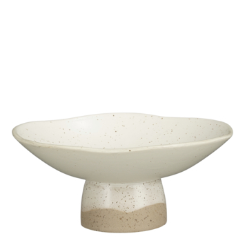 Deze decoratieschaal op voet van steengoed heeft een eenvoudig en stijlvol ontwerp met een tweekleurige afwerking: een off-white bovendeel met subtiele spikkels en een natuurlijke klei-afwerking aan de onderkant. De kom voegt een rustieke, moderne touch toe aan je interieur. Hij heeft een hoogte van 12 cm en een diameter van 26,5 cm.