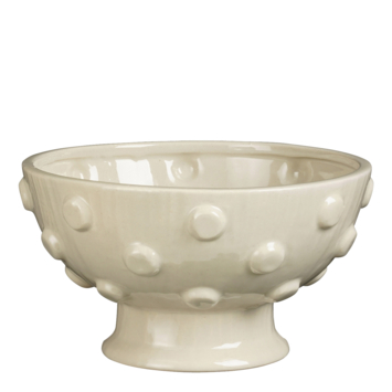 Deze keramieken schaal valt op door het speelse reliëf en de elegante voet. De zachte witte kleur geeft een rustige, stijlvolle uitstraling die past in elk interieur. Ideaal als fruitschaal, decoratiestuk of voor het serveren van lekkernijen op tafel. Ook mooi in een open kast als blikvanger. De afmetingen zijn H16 x ø28,5 cm.