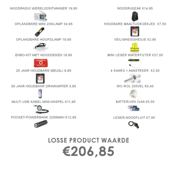 - 1 dag aan houdbaar voedsel en water, met een noodrantsoen dat tot 25 jaar meegaat.