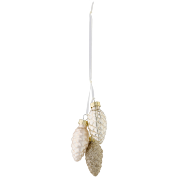 Koker met 12 dennenappels gemaakt van glas die je in de kerstboom kan hangen. Ook verkrijgbaar in de kleur donkerbruin.