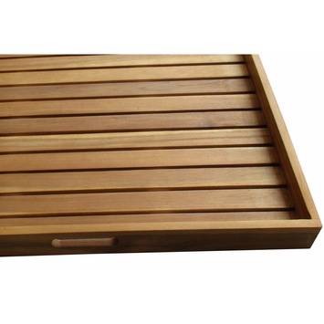 Het dienblad renzo acaciahout teak 70 cm gebruik je gemakkelijk op een grote tuintafel of bij een loungeset. Je kunt dit dienblad natuurlijk decoratief gebruiken, maar het dienblad kan ook erg handig zijn tijdens bijvoorbeeld een barbecue. Het dienblad is gemaakt van acaciahout. Dienblad Renzo acaciahout teak 70 cm is 6,5 centimeter hoog, 70 centimeter breed en 70 centimeter diep.