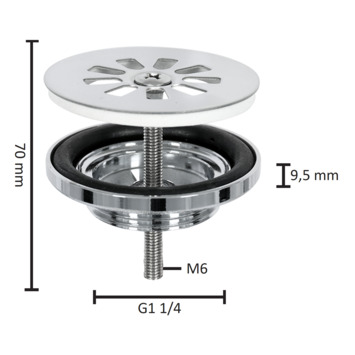 Deze afvoerplug is eenvoudig te monteren: met een diameter van 65 mm een lengte van 70 mm en M6 schroefdraad past deze plug op reguliere water afvoeraansluitingen.