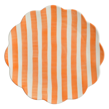 Voeg extra flair toe aan je tafelsetting met het oranje-wit gestreepte dinerbord, afgewerkt met subtiele boogjes in de rand. Het schattige bord is gemaakt van steengoed en is bestend tegen de vaatwasser en magnetron. Hierdoor is hij erg geschikt voor dagelijks gebruik. Hij heeft een hoogte van 2 cm en een diameter van 26 cm.