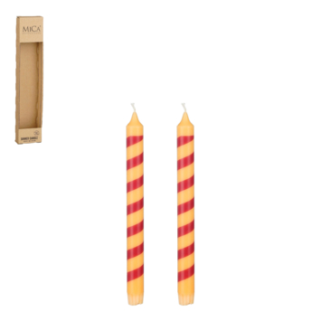 Een prachtige kaars om te branden, maar ook om ten toon te stellen in je interieur. Deze dinerkaars trekt ook zonder vlam de aandacht. De kaars heeft een gele kleur met schitterende donkerroze swirl. Vervaardigd uit stearine en met een afmeting van H25 xø2,5 cm voegt deze kaars een vleugje elegantie toe aan je ruimte.