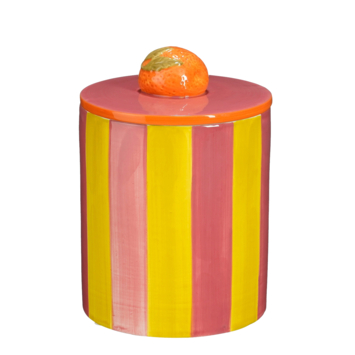 Breng een vleugje speelsheid en kleur in je keuken met de Dion voorraadpot. Deze opvallende pot, vervaardigd uit dolomiet, heeft een levendig streepjespatroon in roze, geel en oranje en is perfect voor het lente- en zomerseizoen. Met een inhoud van 1,8 liter biedt hij voldoende ruimte voor diverse ingrediënten of snacks. De deksel is voorzien van een schattig sinaasappeldetail, wat de pot een vrolijke uitstraling geeft. Een unieke en praktische toevoeging aan je keuken!