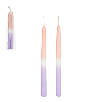 Een prachtige kaars om te branden, maar ook om ten toon te stellen in je interieur. Deze dip-dye dinerkaars is ook zonder vlammetje een echte eyecatcher. De set bestaat uit 2 kaarsen. Deze lichtroze met lila kaarsen hebben een formaat van H30 x Ø2,2 cm.