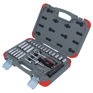 Deze dopsleutelset met 1/4"-dopsleutels van 3mm tot 13mm bestaat uit 41 delen. De set bevat 21 dopsleutels, 12 bits en diverse accessoires, zoals een ratel, een knikstuk en een verlengstuk. De dopsleutels uit deze set zijn gemaakt van hoogwaardig chroom-vanadiumstaal. 12 van deze stevige dopsleutels hebben een 1/4inch-verbinding, oftewel een verbinding van 6,3mm. Daarnaast bevat de dopsleutelset nog 9 extra lange dopsleutels. De dopsleutels en lange dopsleutels uit de set hebben een sleutelwijdte variërend van 3mm tot 13mm. In de bijbehorende handige box berg je alle dopsleutels, bits en accessoires goed en overzichtelijk op.