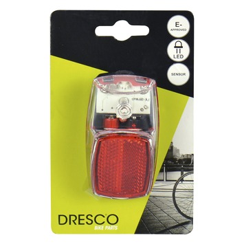 Goede fietsverlichting achterop de fiets is onmisbaar om gezien te worden. Dit Dresco achterlicht met E-keurmerk, is speciaal voor montage op een achterspatbord en heeft 1 krachtige rode LED en een reflector. Het achterlicht heeft een licht- en beweging sensor en drie verschillende functies: aan/knipperlicht/uit. Eenvoudig te bedienen door de handige drukknop op de bovenzijde van het achterlicht. Te monteren op alle achterspatborden met de meegeleverde bout en moer. Werkt op 2 meegeleverde AAA/LR03 batterijen.