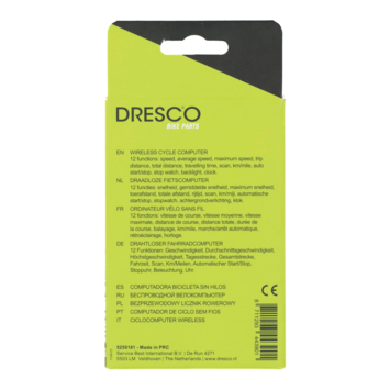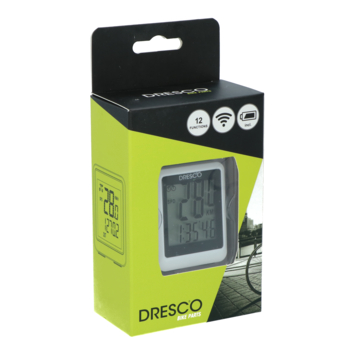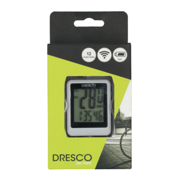 De Dresco draadloze fietscomputer is een handig apparaat. De draadloze fietscomputer heeft een groot display waarop de 12 functies gemakkelijk af te lezen is. Om de 4 seconden worden de 12 verschillende waarden gemeten: maximum snelheid, gemiddelde snelheid, totale afstand, toerafstand, scan, rijtijd, automatische start/stop, stopwatch, klok, achtergrondverlichting, km/mijl en de snelheid. De fietscomputer is spatwaterdicht, waardoor je ook in de regen kan fietsen. Met de handige meegeleverde klemmen is de fietscomputer gemakkelijk te bevestigen. Ook zijn batterijen meegeleverd.