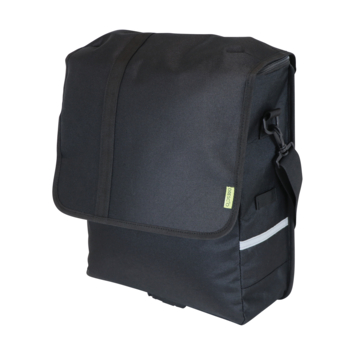 De Dresco fietstas is een stevige zwarte tas met een inhoud van 20 liter die ook als schoudertas gebruikt kan worden. De tas is gemaakt van waterafstotend nylon heeft een extra verstevigde rug en bodem. De schoudertas heeft twee vakken, waarvan er één speciaal voor een laptop is met een maximale grote van 15,6 inch. De tas heeft daarnaast een transparante laptop beschermhoes. De Dresco fietstas is makkelijk aan de bagagedrager te bevestigen met de clips aan de achterzijde van de tas. De tas is afsluitbaar is met een de rits- en klittenbandsluiting. De fietstas is in een handomdraai van de bagagedrager te halen en met de afneembare verstelbare schouderriem neemt u de tas makkelijk mee. Daarnaast is de fietstas voorzien met een bevestigingsmogelijkheid voor draagbare lampjes. In het donker bent u extra zichtbaar door de reflecterende bies aan de voor- en achterzijde. De tas heeft een afmeting van 43x35x17 cm.