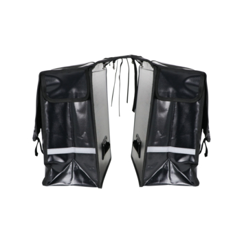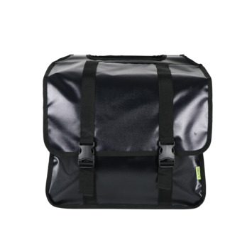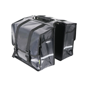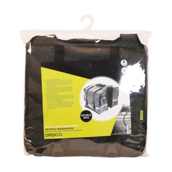 De Dresco dubbele fietstas Transporter is een handige sterke fietstas met een ruime inhoud van 40 liter. De zwarte tas is gemaakt van waterafstotend bisonyl en de regenoren aan de zijkanten voorkomen het inregenen. De Dresco Transporter tas is makkelijk aan de bagagedrager te bevestigen met de gespbevestiging. De bovenzijde bestaat uit twee banden zodat u de Ledverlichting, snelbinders of kinderzitje gewoon kunt blijven gebruiken. De tas is afsluitbaar is met een handige verstelbare klik- en klittenbandsluiting. De tas heeft een extra verstevigde rug en bodem. In het donker bent u extra zichtbaar door de reflecterende bies aan de voor- en achterzijde. De tas heeft een afmeting van 33x39x15 cm (2x).