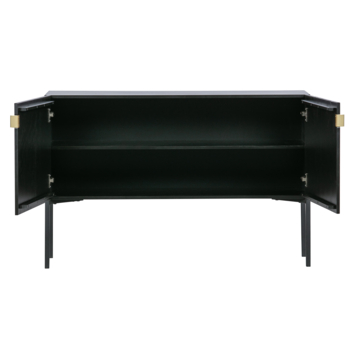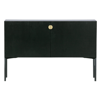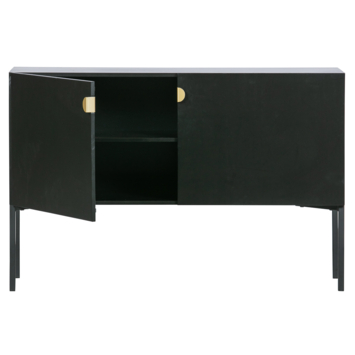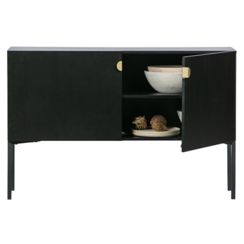 Elegant en stoere sidetable. Massief grenen met zwarte afwerking en goudkleurige greep. Voorzien van kastbrede legplank. Afmetingen (hxbxd): 76 x 116 x 35 cm.