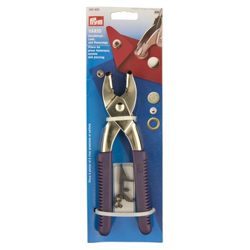 De drukknopentang is een tang geschikt voor drukknopen en om perforaties mee te maken. Met deze vario tang bevestig je eenvoudig alle Prym drukknopen, jeansknopen en ringen. De tang wordt standaard met 2 ponsmatrijzen van 3 en 4 millimeter