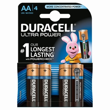 Duracell Ultra Power Duralock alkaline batterij, een krachtige 1,5 volt penlite batterij, voor langdurige energie in een groot aantal elektrische apparaten, zoals scheerapparaat, afstandsbediening, zaklamp, tandenborstel, enzovoort. Duralock-technologie garandeert dat de batterij betrouwbare langdurige energie levert. Zeker praktisch als je al lange tijd geen gebruik hebt gemaakt van een apparaat, zoals zaklamp (bij stroomstoring). De batterij is voorzien van Powercheck, een geïntegreerde tester dat laat zien hoeveel energie er nog in de batterij zit. Verpakking: 4 stuks.