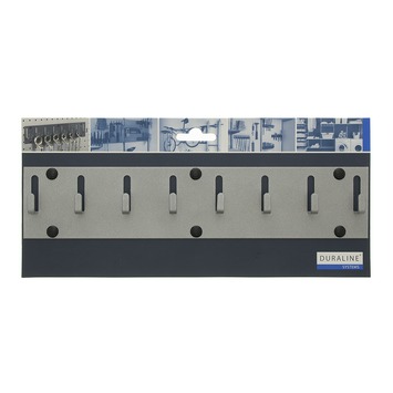 De Duraline ophanghaken mat zilver is een metalen strip met 8 haken. Je bevestigt eenvoudig de strip met schroeven of druknagels.
