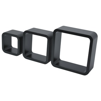 Met deze zwart gelakte kubusset versier je je saaie, kale wand. Deze set bestaat uit 3 kubussen in 3 verschillende maten, waarbij de grootste een afmeting van 30x30 cm heeft. In de kubussen kun je je leukste foto's of accessoires een mooi plekje geven.