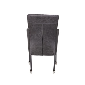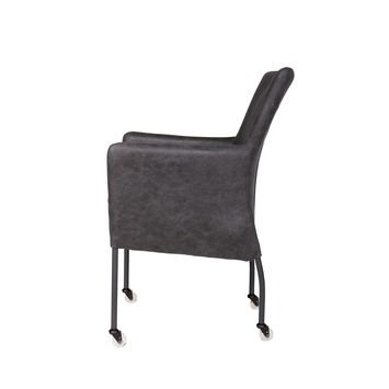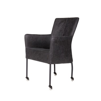 Een moderne strakke echt lederen eetkamerstoel Breeze met dichte armleuningen. De stoel Breeze heeft metalen poten die voorzien zijn van transparante en parket/laminaatvriendelijke kunststof wielen. De stoel Breeze is bekleed met oersterk zwart geborsteld pilotenleder (rundsleder) dat iets ruw aanvoelt. Het zwarte leder in combinatie met de slanke metalen zwart gelakte buispoten met transparante wieltjes maken van deze stoel een blikvanger in elk interieur. De eetkamerstoel Breeze heeft de afmetingen (bxdxh): 59x60x90,5 cm. De armleuninghoogte van af de vloer is 67,5 cm. De zitdiepte is 44 cm en de zitbreedte, verloopt van voor naar achter, van 45 cm naar 35 cm. De zithoogte, verloopt van voor naar achter,van 48 cm naar 44 cm en de rughoogte is 48 cm. Een eetkamerstoel van hoge kwaliteit met een heerlijk zitcomfort. Een stoel waarop lekker lang tafelen een genot is.