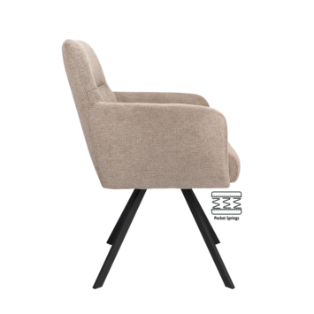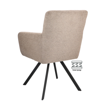 Wat deze stoel bijzonder maakt, is het hoge zitcomfort. De zitting is voorzien van pocketvering, wat zorgt voor optimale ondersteuning – ideaal voor lange etentjes of ontspannen avonden aan tafel. De rugleuning en armleuningen dragen bij aan een comfortabele zithouding, zodat je er moeiteloos uren op doorbrengt.