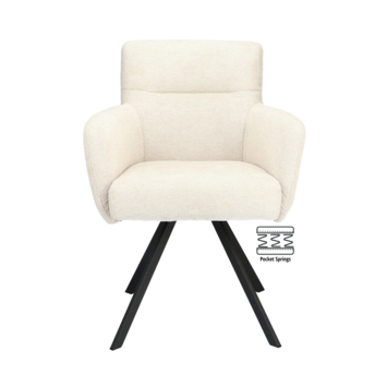 Niet alleen het uiterlijk maakt indruk, ook het zitcomfort is uitzonderlijk. De zitting is voorzien van pocketvering, waardoor je ook bij langdurig zitten – zoals tijdens een diner of een avond natafelen – optimale ondersteuning en comfort ervaart. De armleuningen zorgen daarbij voor extra ontspanning.