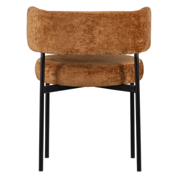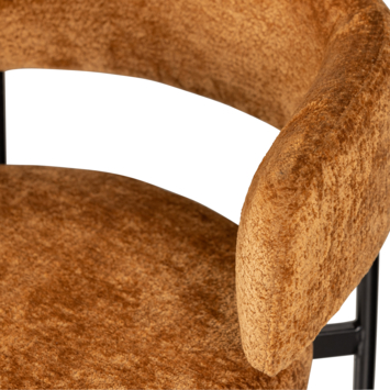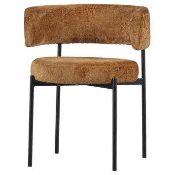Lianne is bekleed met een teddy stof (100% PES) in cognac. De poten zijn gemaakt van metaal en afgewerkt met een mat zwarte poedercoating. Brengt een rustige en moderne sfeer aan de eettafel.