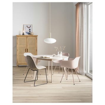 Eetkamerstoel Mila is gestoffeerd in een beige fluweel polyester stoffering met een zwart metaal onderstel. De stoel heeft een luxe uitstraling en staat leuk in meerdere ruimtes in het huis. De stoel heeft een kuipvormige zitting die heerlijk zit. Eetkamerstoel Mila is leuk te combineren met andere stoelen.