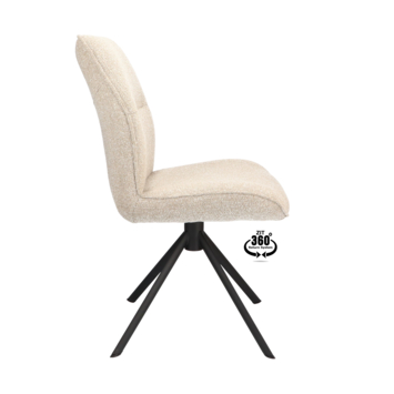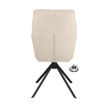 Een opvallend kenmerk van deze stoel is de 360 graden draaibare zitting. Hierdoor beweeg je moeiteloos mee tijdens een gesprek of wanneer je opstaat van tafel. De stoel beschikt bovendien over een terugdraaisysteem, waardoor hij automatisch terugdraait naar zijn originele positie – netjes en overzichtelijk in je interieur.