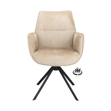 De eetkamerstoel Onne Movie desert beige chenille stof met armleuning is een stijlvolle draaistoel die comfort en elegantie moeiteloos combineert. De zachte chenille bekleding in de kleur desert beige voelt warm en uitnodigend aan en voegt een verfijnde, moderne uitstraling toe aan jouw eetruimte. De zwarte metalen poten zorgen daarbij voor een krachtig, eigentijds accent.
