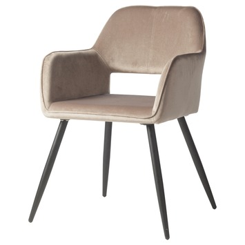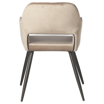 Eetkamerstoel Vera is gestoffeerd in een beige fluweel polyester stoffering met een vier metalen poten. De stoel heeft een unieke luxe uitstraling en staat leuk in meerdere ruimtes in het huis. De stoel heeft een rechthoekige gevormde zitting die heerlijk zit. Eetkamerstoel Vera is leuk te combineren met andere stoelen.